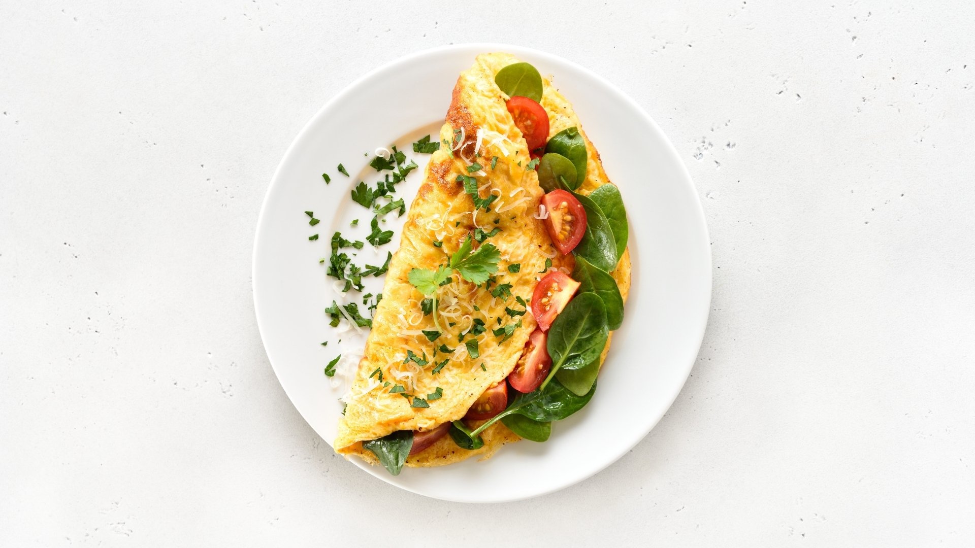 Pequeno-almoço: omelete com 2 a 3 ovos, com espinafres, cogumelos, tomate cherry e uma peça de fruta.