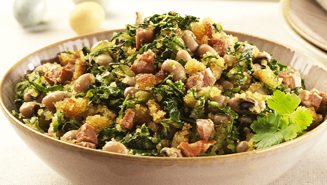 A Vitela Estufada com Migas e Feijão Frade é um prato reconfortante. A carne de vitela é estufada lentamente para que chegue ao prato tenra. As migas, preparadas com pão e aromatizadas com alho e azeite, combinam na perfeição com o feijão frade, e criam um acompanhamento rico em sabor. Na hora de servir, aqueça a vitela e finalize com salsa fresca picada.