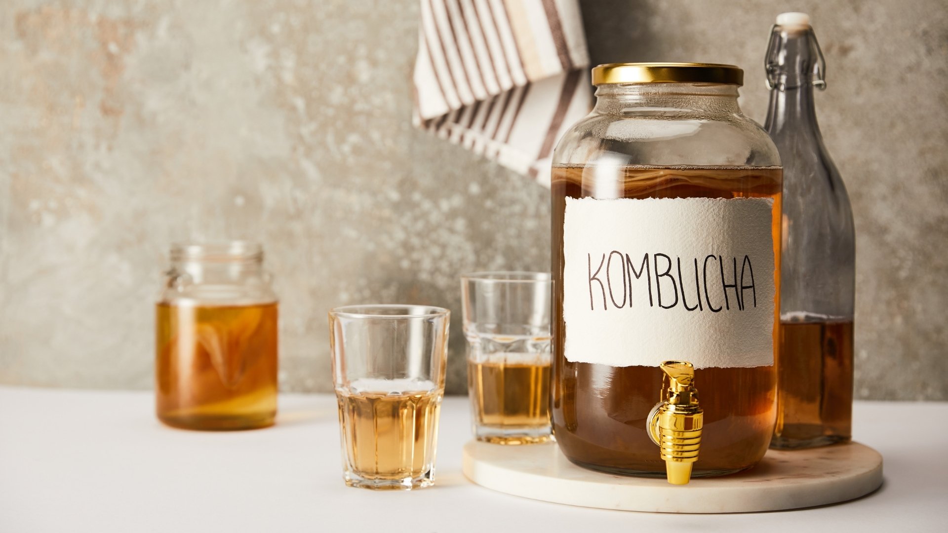 - Um copo de kombucha não pasteurizada e tosta de pão integral com húmus e folhas.