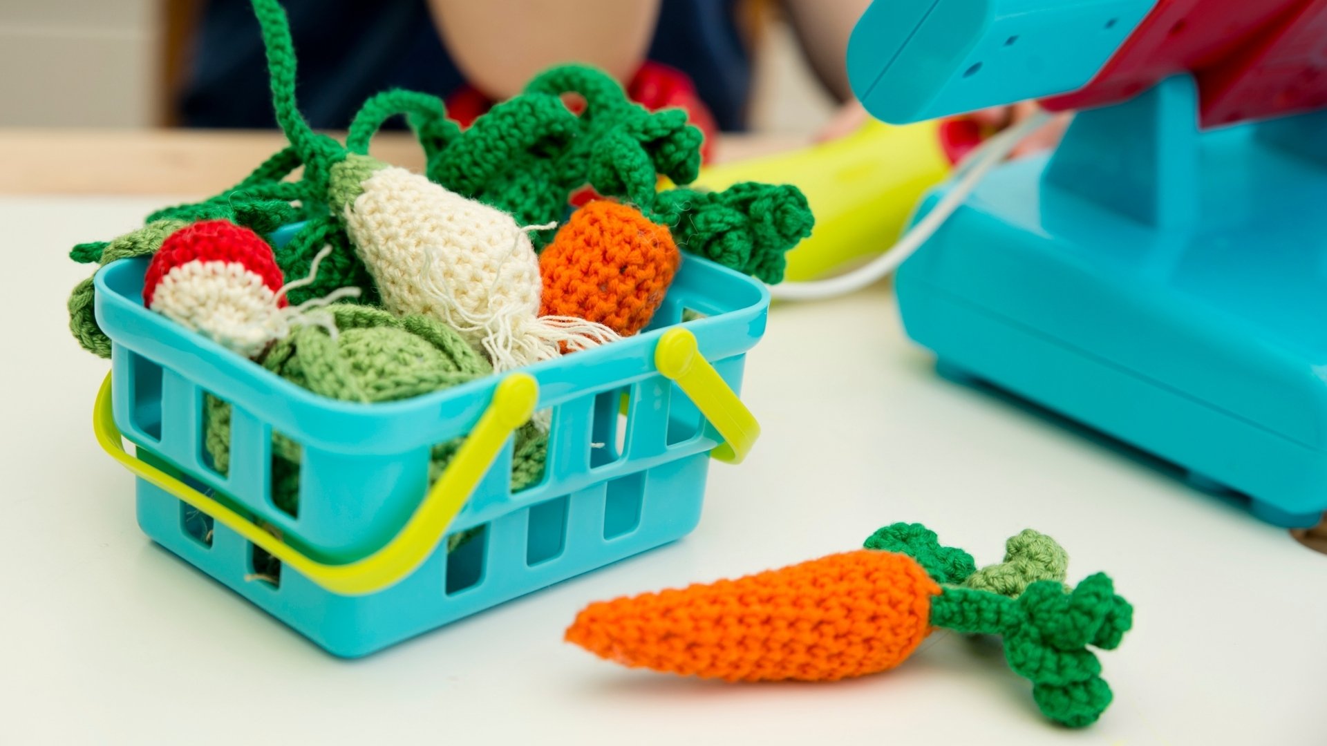 Transforme a sala num supermercado imaginário. Separe diferentes alimentos (de brincar e aproveite até alguns reais, como os hortofrutícolas, embalagens de leite/ bebida vegetal) por “bancas” correspondentes aos grupos da Roda: uma das frutas, outra dos legumes, outra dos cereais, e assim sucessivamente.
