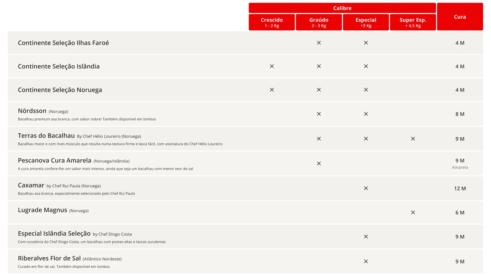 Já o bacalhau Especial Islândia Seleção Chef Diogo Rocha chega diretamente das águas frias e puras da Islândia. Salgado no próprio dia em que é pescado, este bacalhau passa por uma cura prolongada de nove meses, que intensifica o sabor e garante uma textura única, perfeita para receitas sofisticadas e memoráveis. Uma escolha que reflete excelência em cada detalhe.