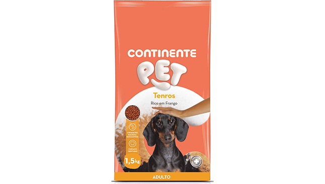 Nos supermercados Continente pode encontrar várias opções de ração para cães.