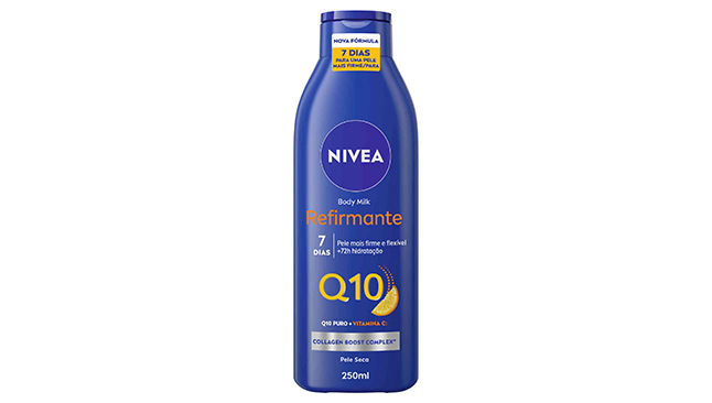 Este Body Milk da Nivea refirma e melhora visivelmente a elasticidade da pele. A sua fórmula com Collagen Boost Complex, Q10 puro e Vitamina C promete resultados em 7 dias.