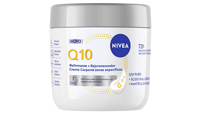 Enriquecido com manteiga de karité, o Creme Q10 Refirmante + Remodelador da Nivea nutre intensamente e deixa a pele mais firme, macia e com aparência rejuvenescida. A sua fórmula combina Q10 puro e ácido hialurónico para combater a perda de firmeza em áreas exigentes, como braços e barriga.