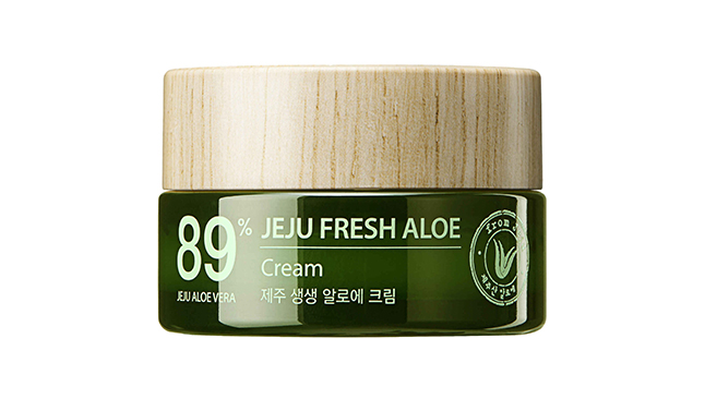 - Creme de rosto Jeju Fresh Aloe The Saem: com 89% de extrato de aloé vera, este creme de textura suave tem um efeito calmante, refrescante e hidratante. Absorve rapidamente sem deixar sensação oleosa.