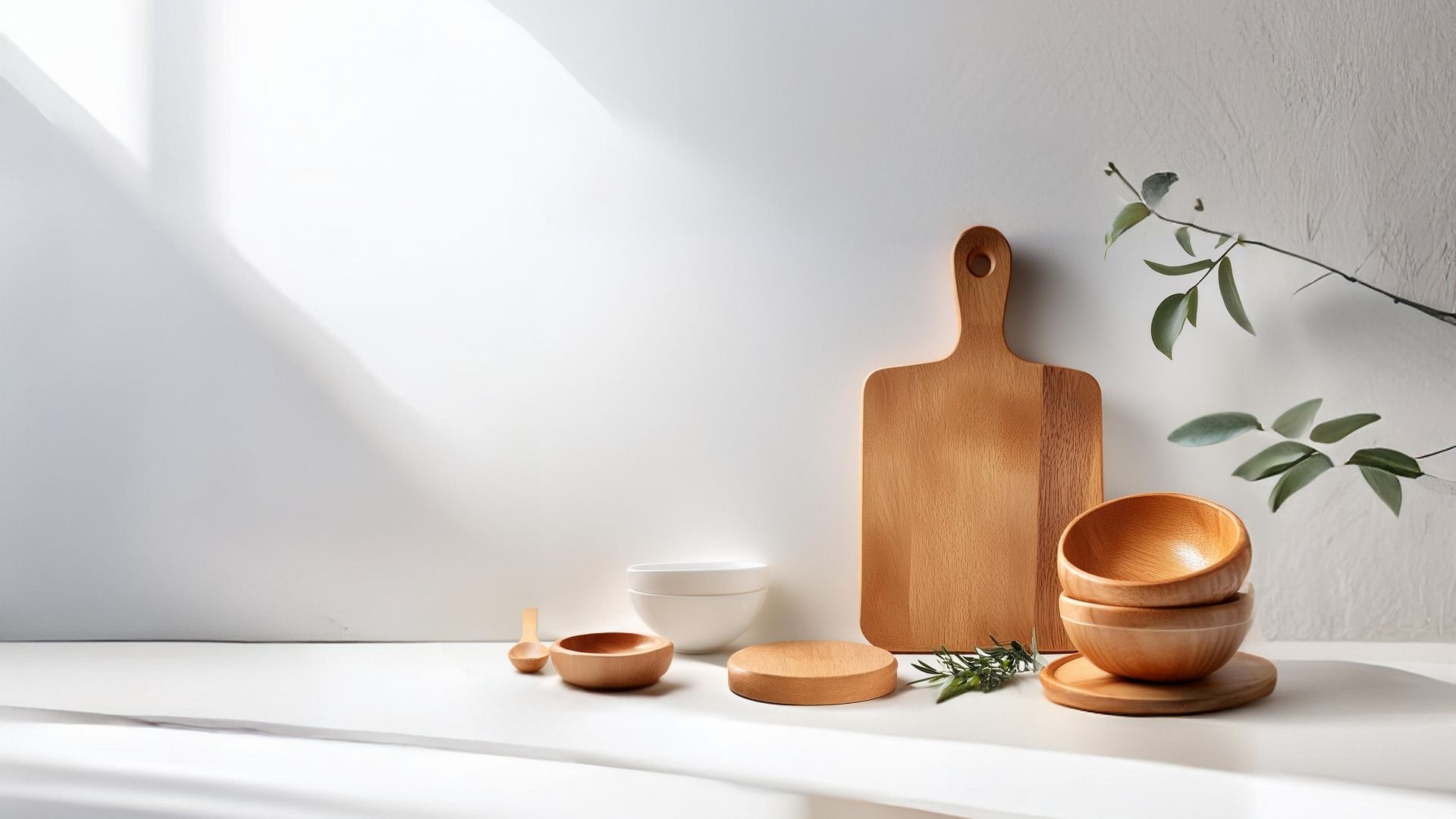 Madeira clara, bambu, fibras naturais e pedra (ou imitações de pedra) dão textura e tornam a cozinha mais acolhedora. Pode usá-los na bancada, em prateleiras, tábuas, cestos ou pequenos móveis de apoio. Mesmo numa base branca ou cinzenta, estes materiais evitam que o ambiente pareça demasiado “frio”.
