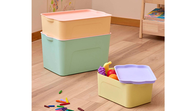 Para tornar a arrumação mais divertida, escolha caixas de arrumação bicolor de diferentes tamanhos, que podem ser empilhadas ou colocadas em prateleiras baixas.
