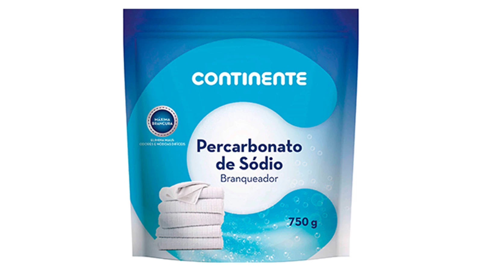 No Continente encontra percarbonato de sódio numa embalagem de 750 g, indicado para roupas brancas ou de cores claras. Só precisa de misturar com um pouco de água até obter uma pasta, aplicar diretamente sobre as nódoas e deixar atuar antes de ir à máquina.