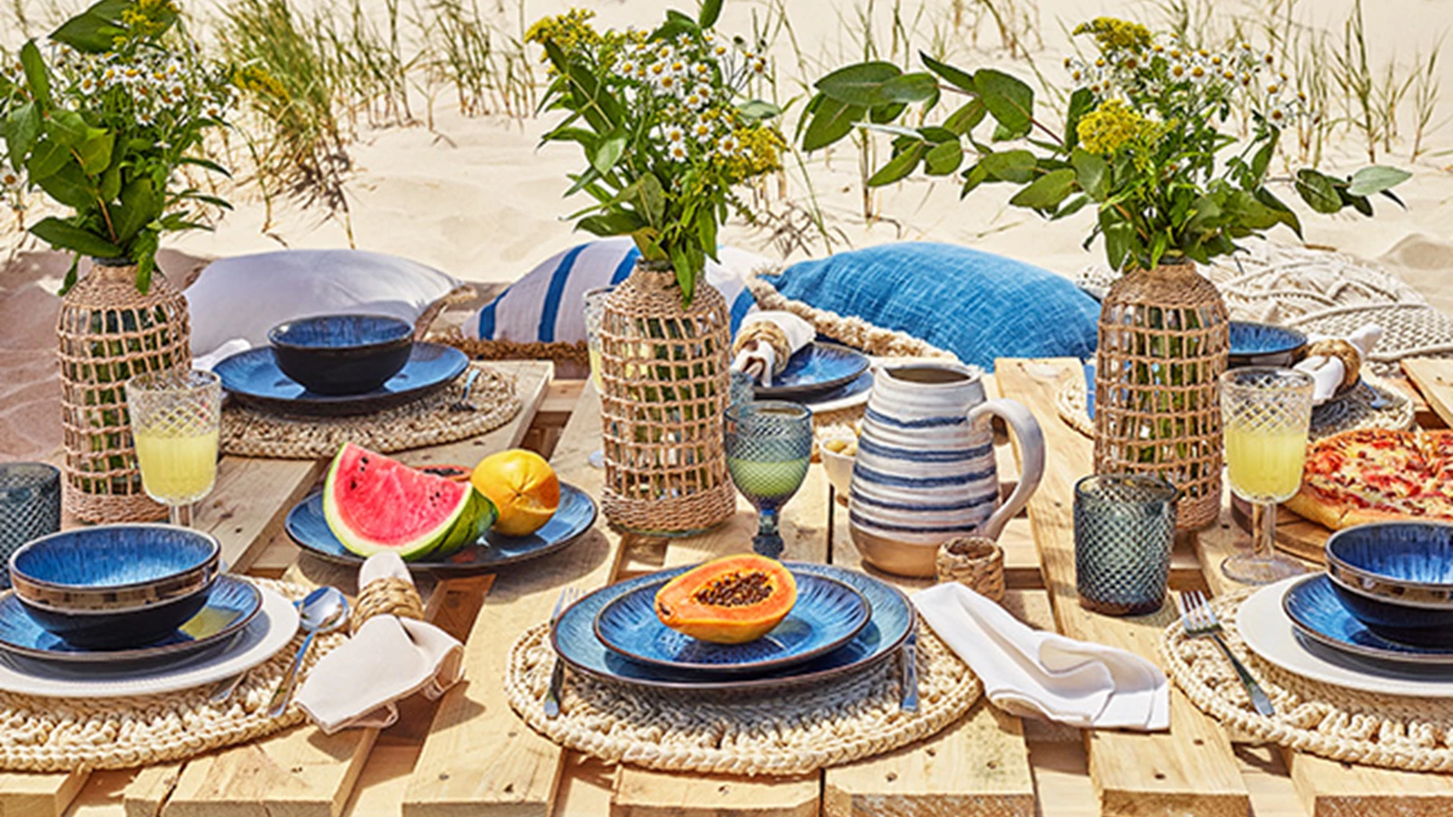 Para um charme campestre, escolha um caminho de mesa em linho e talheres com uma estética vintage. Também aqui não podem faltar flores - sugerimos girassóis para que a mesa diga “verão”. Tenha sempre à mão uma jarra como esta, com água aromatizada para todos se refrescarem.