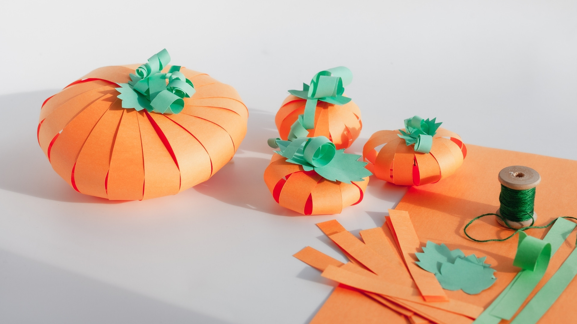 Recorte cartolinas laranja em forma de abóbora e decore com olhos e sorrisos.