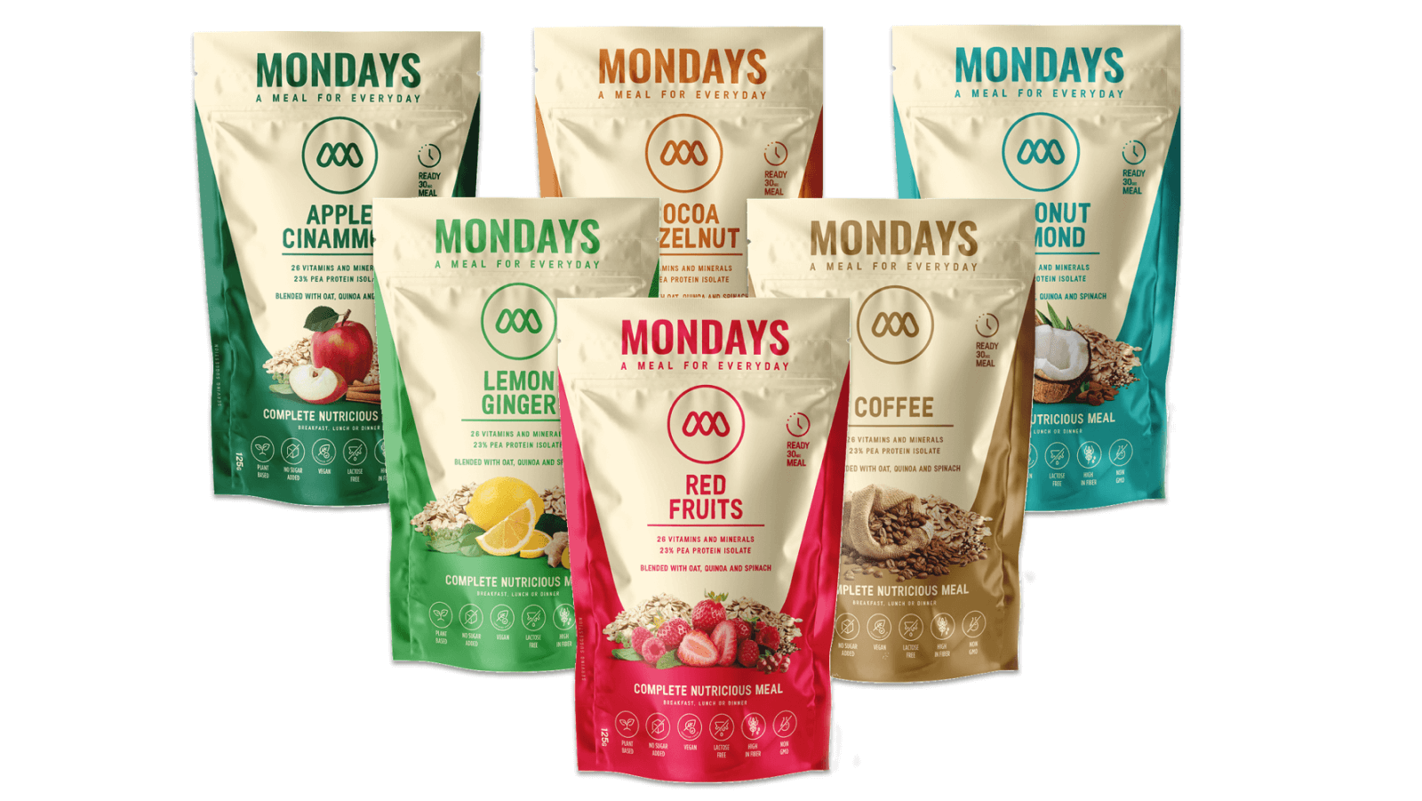 O Mondays constitui uma refeição completa e equilibrada composta por diversos ingredientes naturais. Para além de ser vegan, tem elevado teor de fibra, é fonte de proteína e não contém açúcares adicionados, lactose, soja nem organismos geneticamente modificados. Desenvolvido por nutricionistas, cada Mondays contém 26 vitaminas e minerais para tornar as suas refeições ainda mais nutritivas.