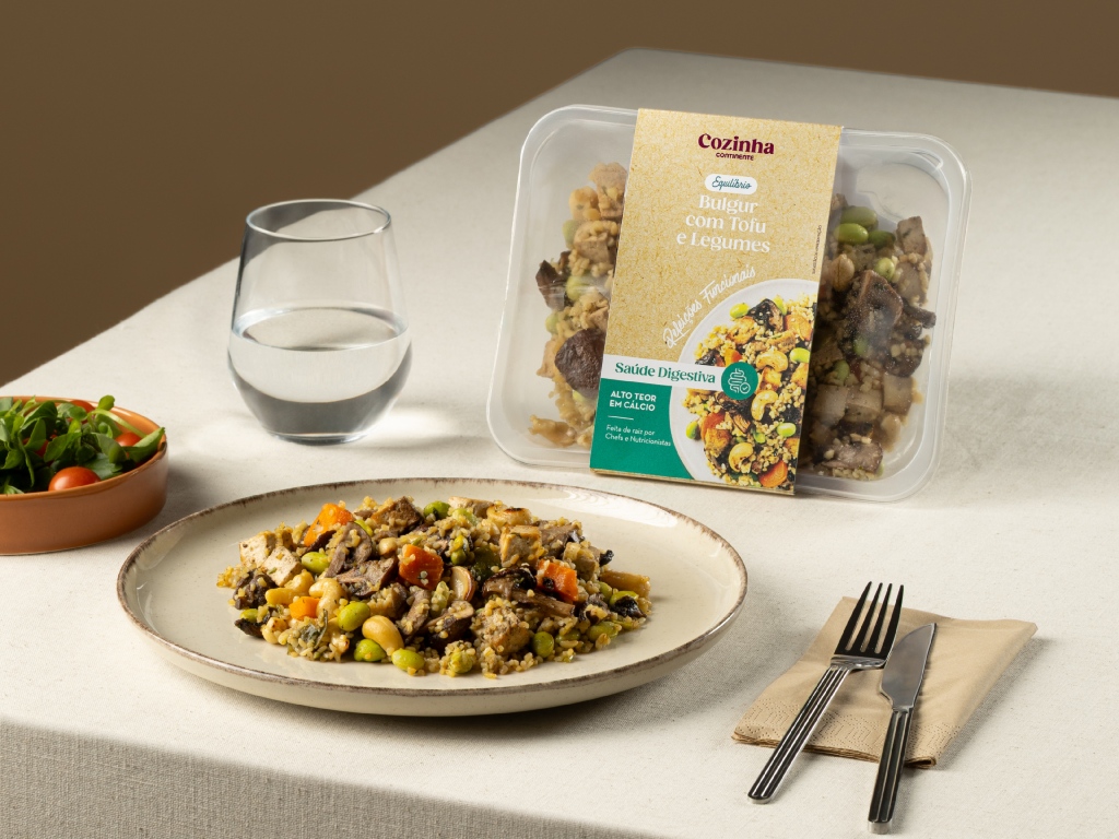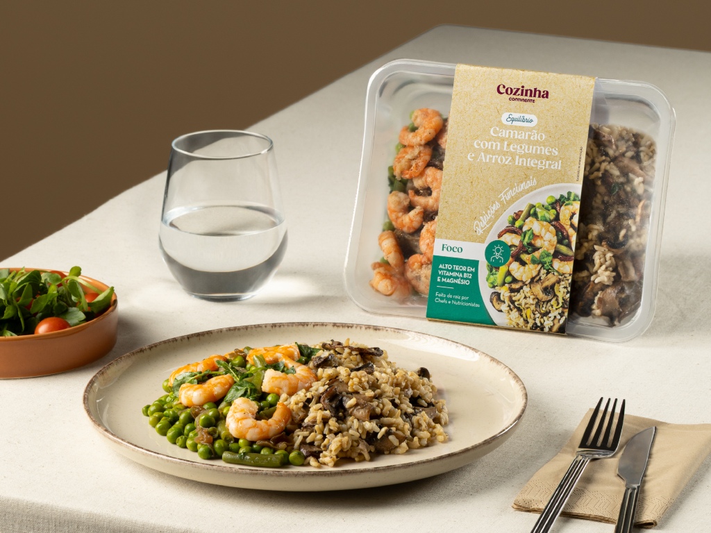 - Com proteínas, cereais integrais, fibra e hortícolas