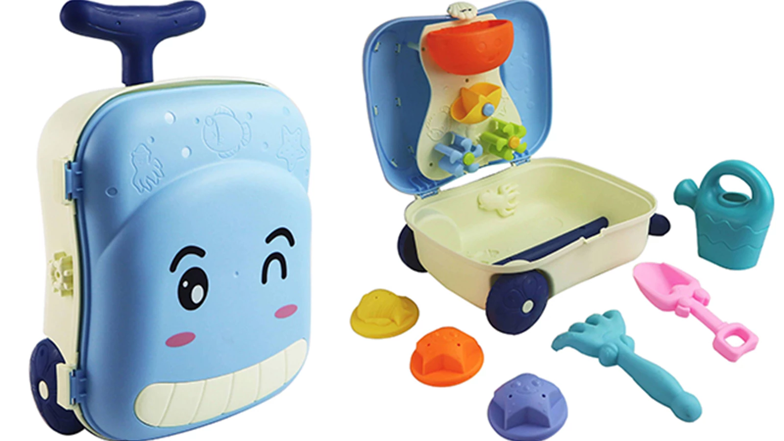 Este trolley de praia vem preparado para horas de diversão. Tem sete peças – pá, ancinho, formas e um moinho – para as crianças darem asas à imaginação e construírem castelos de areia capazes de vencer a maré. E, claro, vão adorar ter a sua própria mala de viagem.