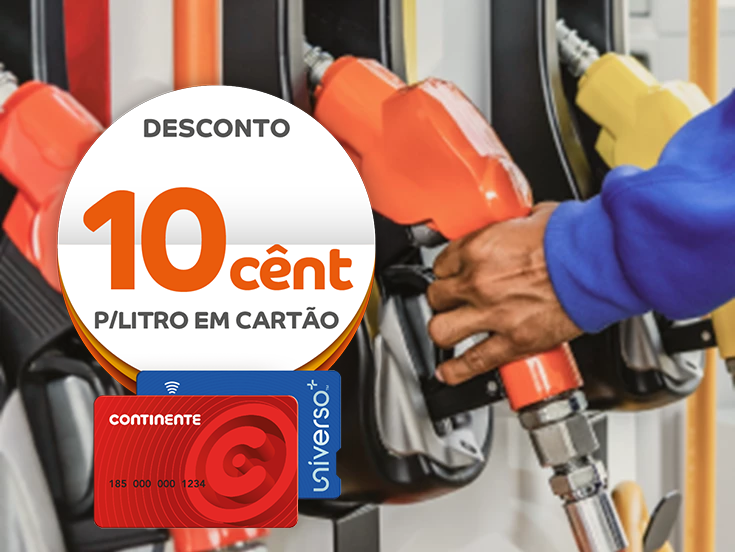 *Válido em Portugal Continental. Nas lojas Continente da Madeira, em compras compreendidas entre os 25€ e 40€ realizadas com Cartão Continente, recebe um cupão de desconto em combustível de 8 cênt/l. Em compras superiores a 40€ com Cartão Continente, recebe cupão de desconto em combustível de 10 cênt/l. Consulte os termos e condições da parceria.