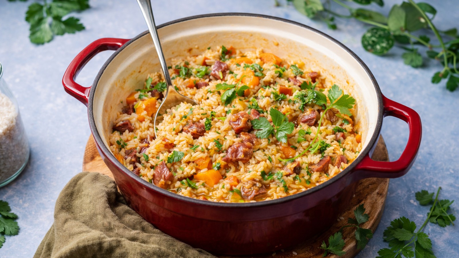 Envolva delicadamente e sirva o arroz carreteiro, polvilhado com salsa.