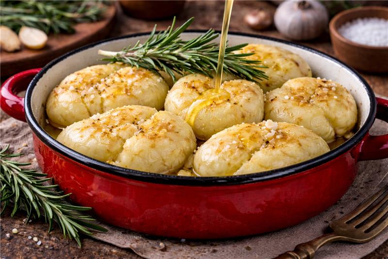 Leve ao forno a 180ºC, até as batatas ficarem douradas.