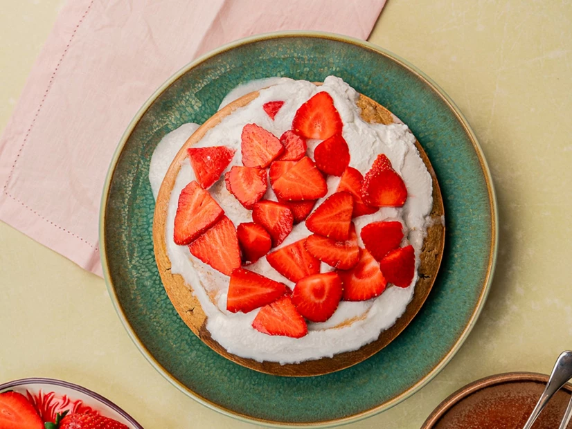 Depois de arrefecido, decore o bolo com o creme de coco batido e os morangos.
