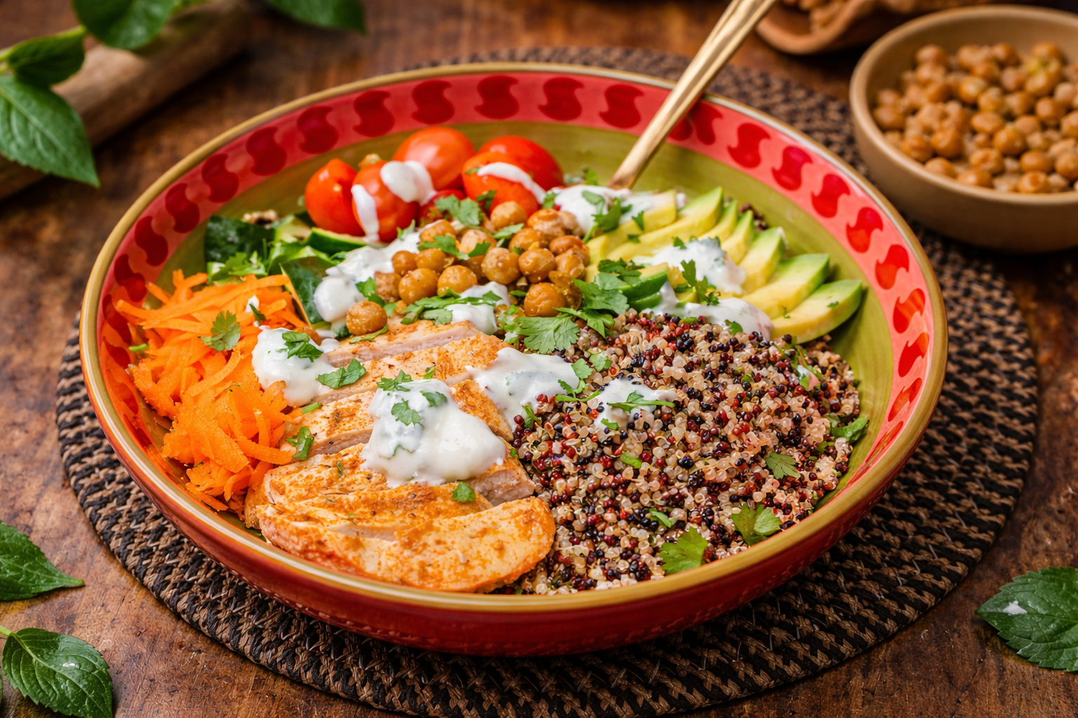 A buddha bowl é uma refeição colorida, equilibrada e nutritiva, composta por diferentes ingredientes dispostos numa só taça, combinando texturas e sabores de forma harmoniosa e saudável.