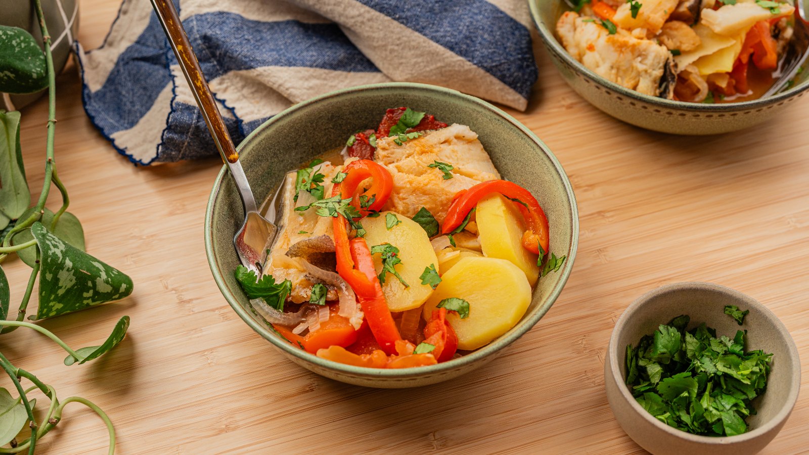 Retire do lume e sirva a caldeirada de bacalhau polvilhada com coentros picados.