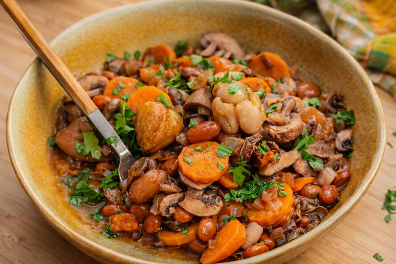 Mexa bem, junte o seitan cortado em cubos e frite por cerca de 5 minutos, continuando sempre a mexer.