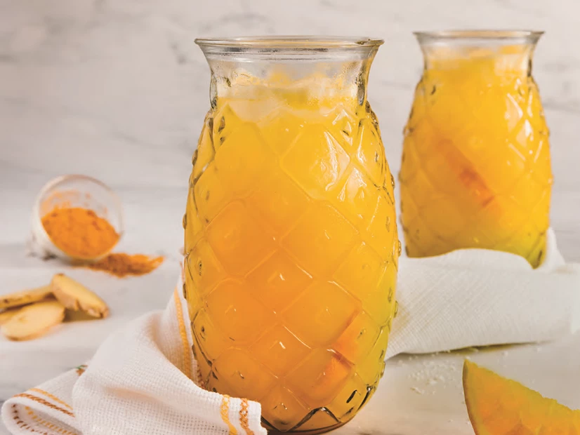 Coloque a água de coco no copo. Junte as laranjas (com casca) cortadas em quartos, o gengibre descascado, o açúcar, as pitadas de sal e pimenta, o açafrão e pressione 2 segundos na velocidade 8.