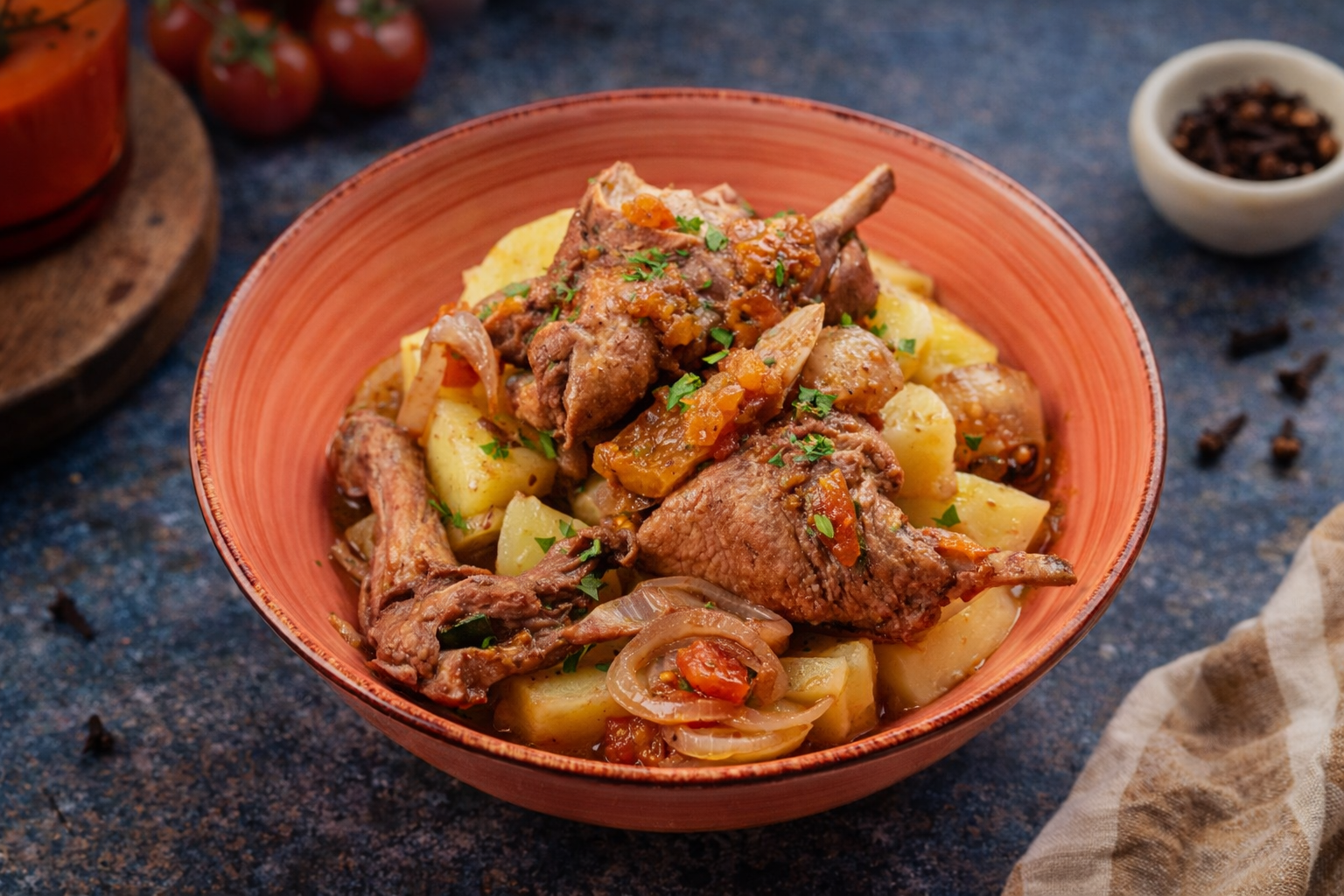 Sirva o coelho à caçador acompanhado de batata cozida.