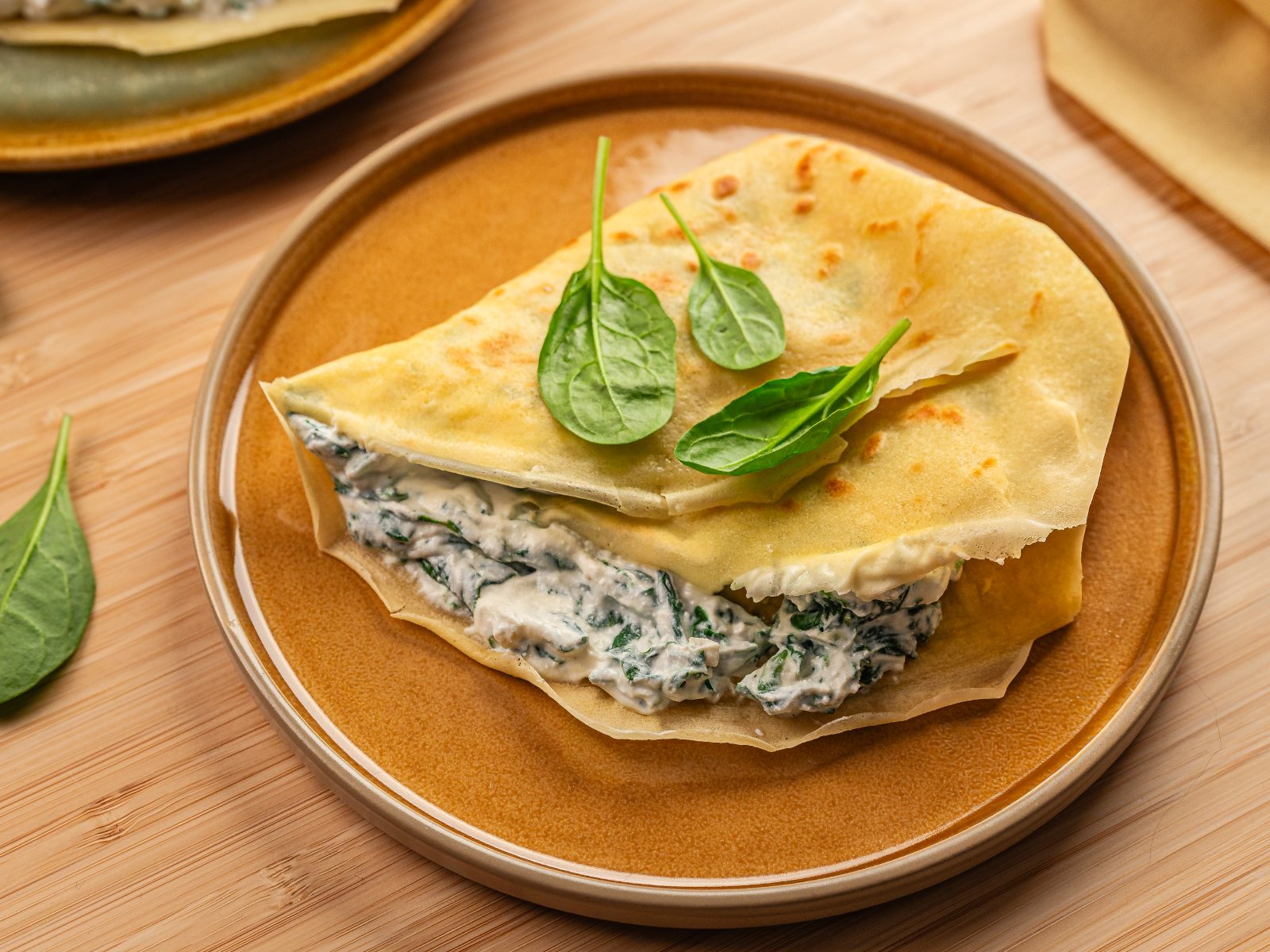 Disponha cada crepe num prato, recheie com a mistura de ricotta e espinafres, dobre ao meio e sirva o crepe de espinafres.