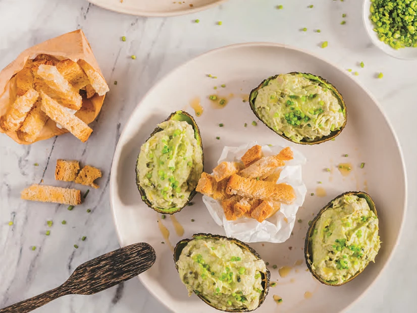 Sirva a pasta de atum na casca dos abacates e polvilhe com cebolinho picado e pimenta preta moída na altura. Acompanhe com pão torrado, cortado em tiras e pincelado com azeite.