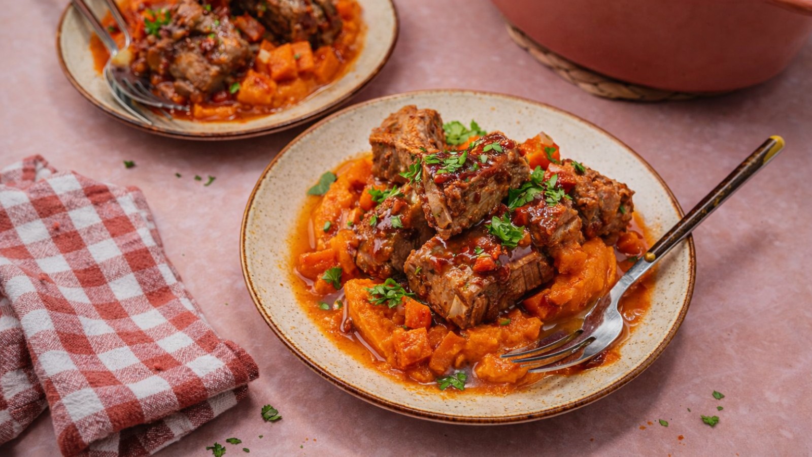 Retire do lume e sirva o entrecosto estufado acompanhado de puré de batata-doce. Finalize com salsa picada por cima.