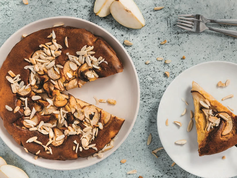 Verta a massa numa forma redonda de fundo amovível (20-22 cm) untada com óleo e polvilhada com farinha. Disponha a restante pera laminada e a amêndoa laminada sobre a massa e leve ao forno cerca de 60-70 minutos.
