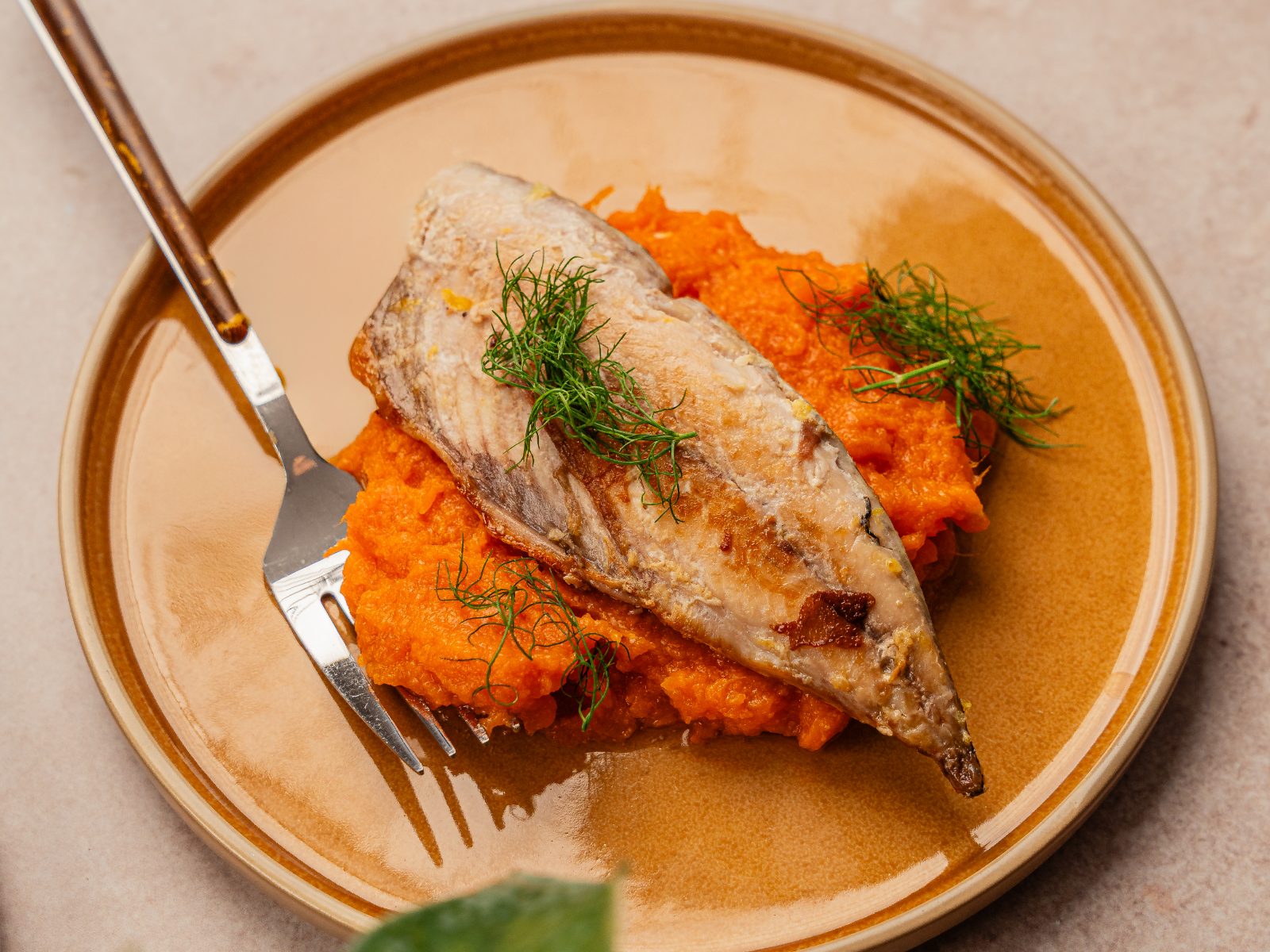 Sirva o peixe com o puré de batata e decore com funcho.
