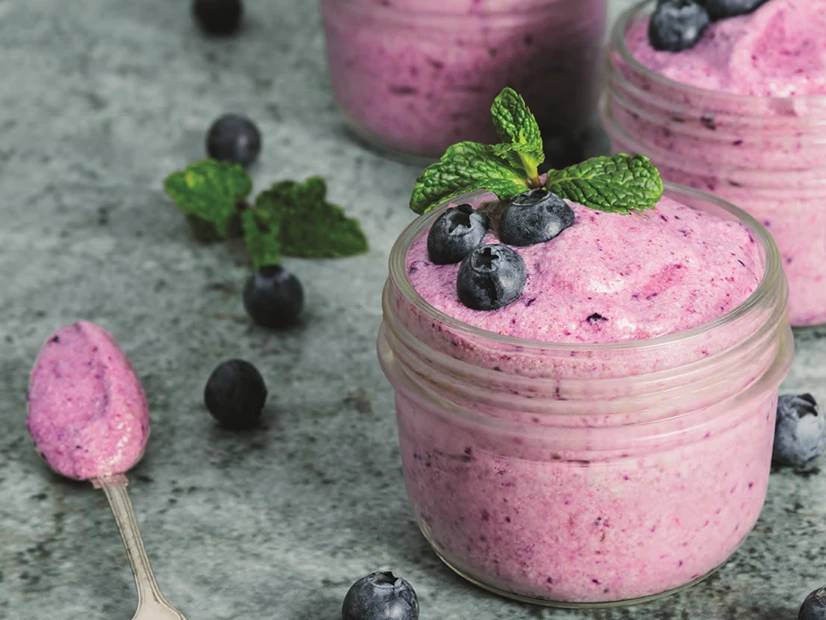 Com a espátula, envolva as claras no preparado do copo, em movimentos suaves, para que não percam o volume, até ter uma mistura leve e homogénea. Divida o fluff em 4 taças, disponha os mirtilos por cima e sirva de imediato.