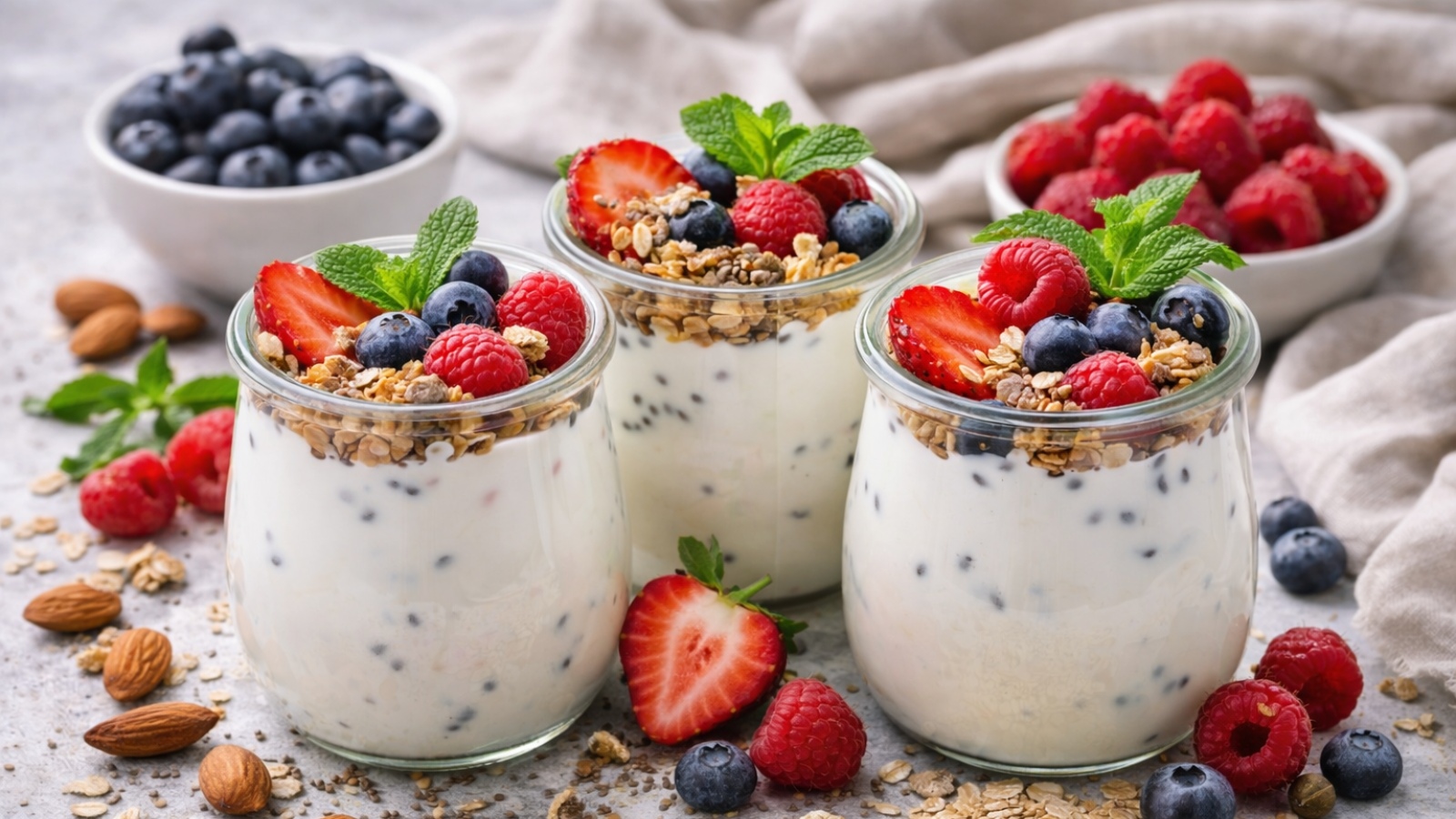 Sirva o iogurte em taças, polvilhe a granola por cima, disponha fruta a gosto e regue com mel.