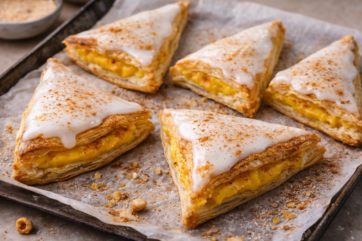 Disponha os pastéis num tabuleiro forrado com papel vegetal. Deixe o glacê criar uma ligeira crosta por 15 minutos. Depois, leve ao forno durante 25 minutos, até a massa folhada estar dourada e o glacê firme.