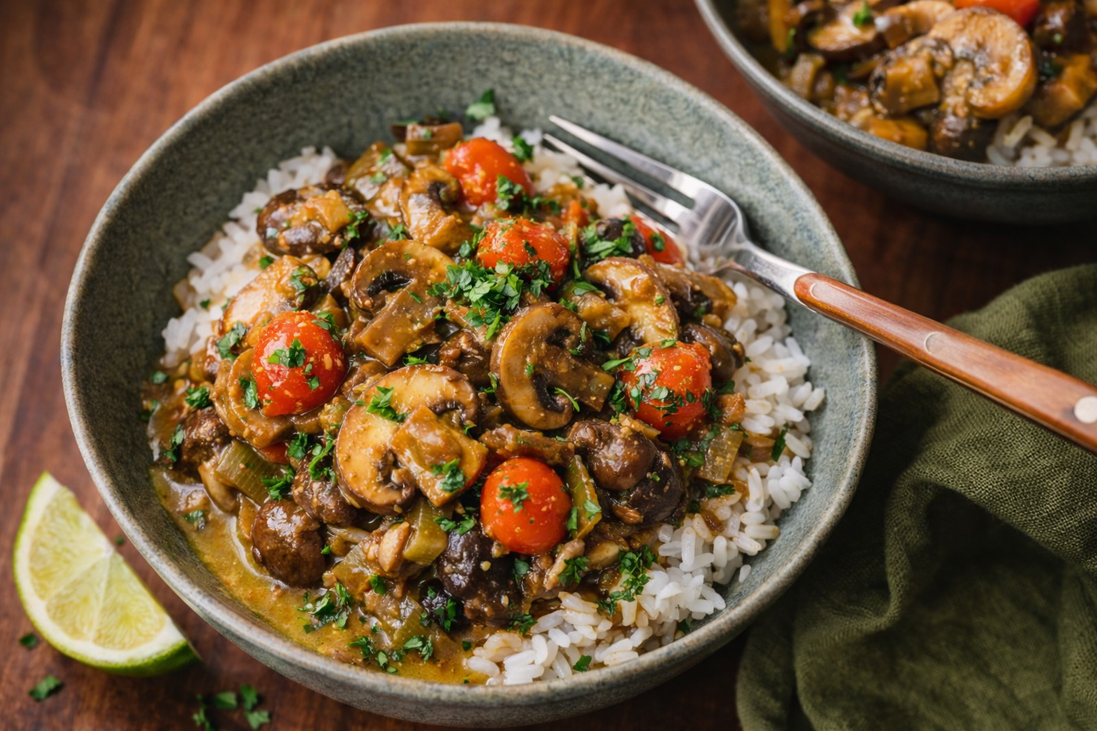 Refogue a cebola roxa em azeite até ficar translúcida. Adicione os pimentos, a curgete, os cogumelos e tempere com sal e pimenta. Deixe cozinhar por alguns minutos.