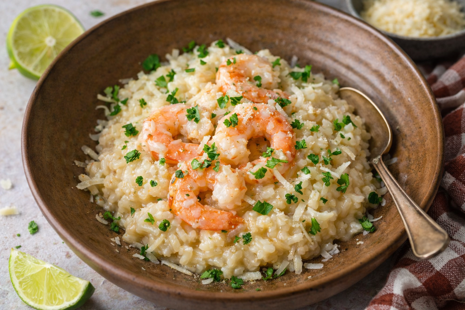 Sirva a massa com gambas, para finalizar decore com queijo parmesão ralado e raspa de lima.