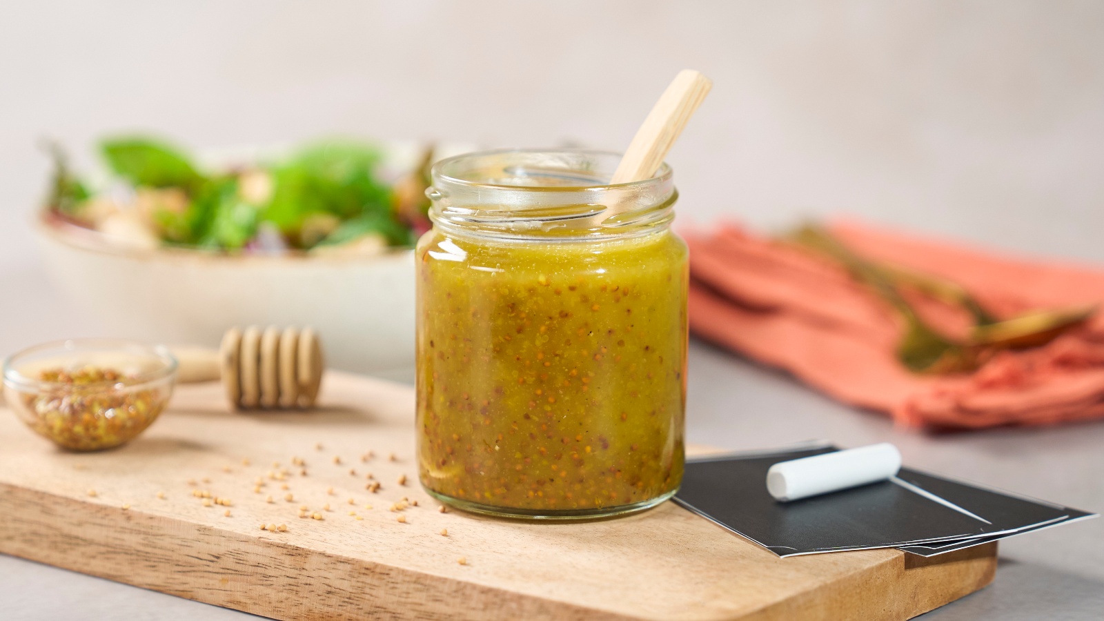 O molho mostarda e mel é uma combinação clássica de sabores, equilibrando o toque doce com a intensidade da mostarda, perfeito para saladas, carnes ou pratos grelhados.
