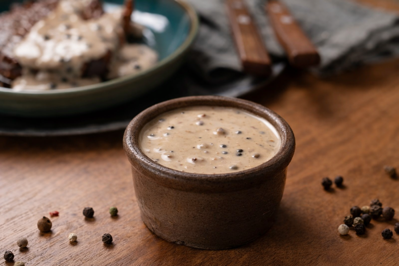 Juntar o caldo de carne, as natas (reservar uma colher de sopa para dissolver o amido) e os grãos de pimenta e misturar.