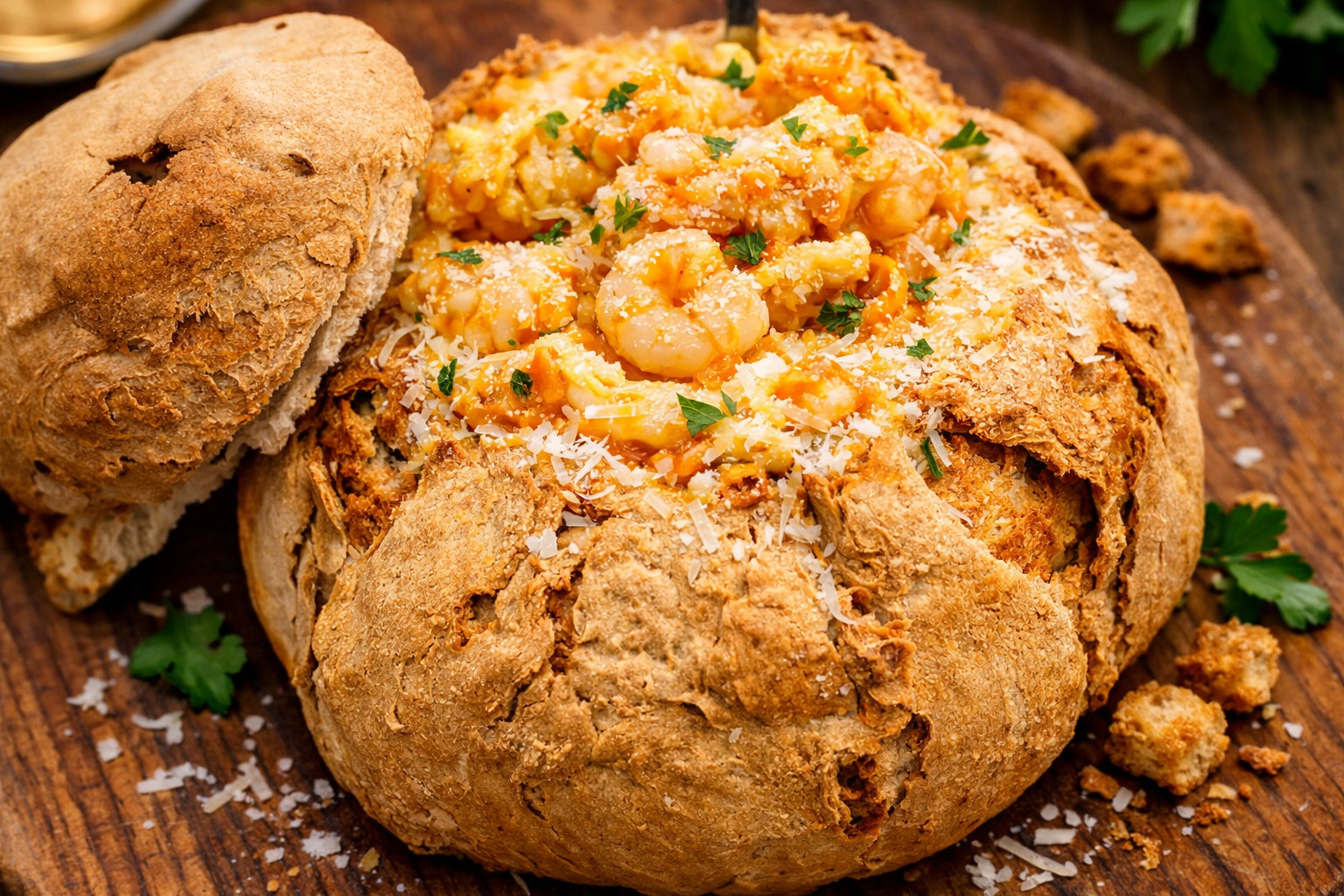 Disponha o preparado no interior do pão, polvilhe com o parmesão e leve ao forno pré-aquecido a 180 ºC por 20 minutos para gratinar.