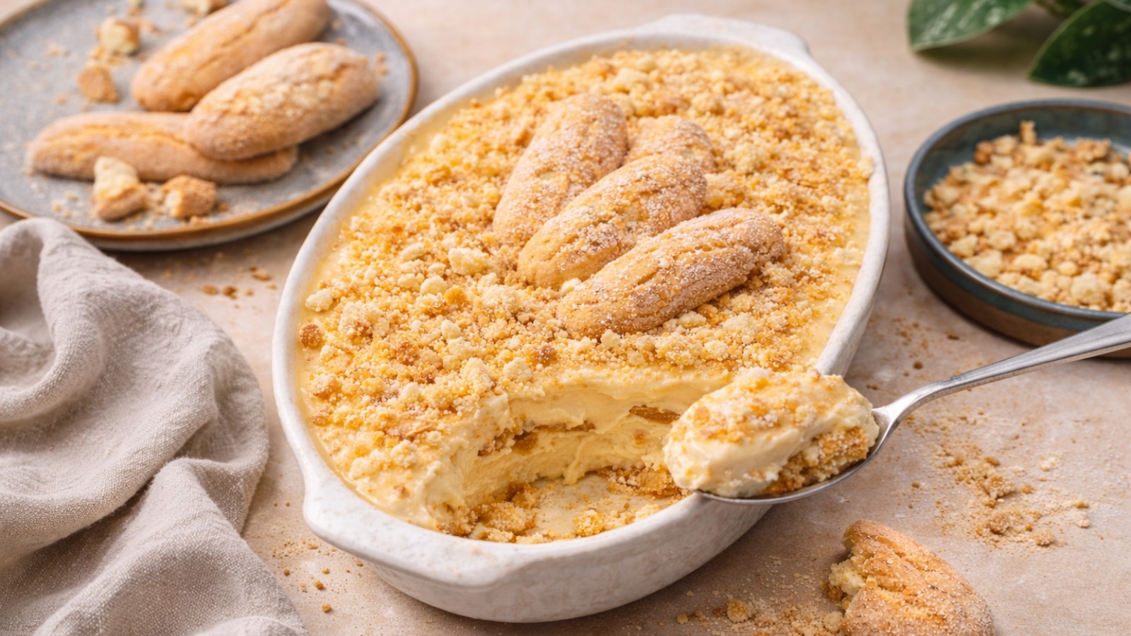 Numa travessa, disponha uma camada de creme. Molhe a bolacha Maria/maizena em leite e faça uma camada de bolacha.