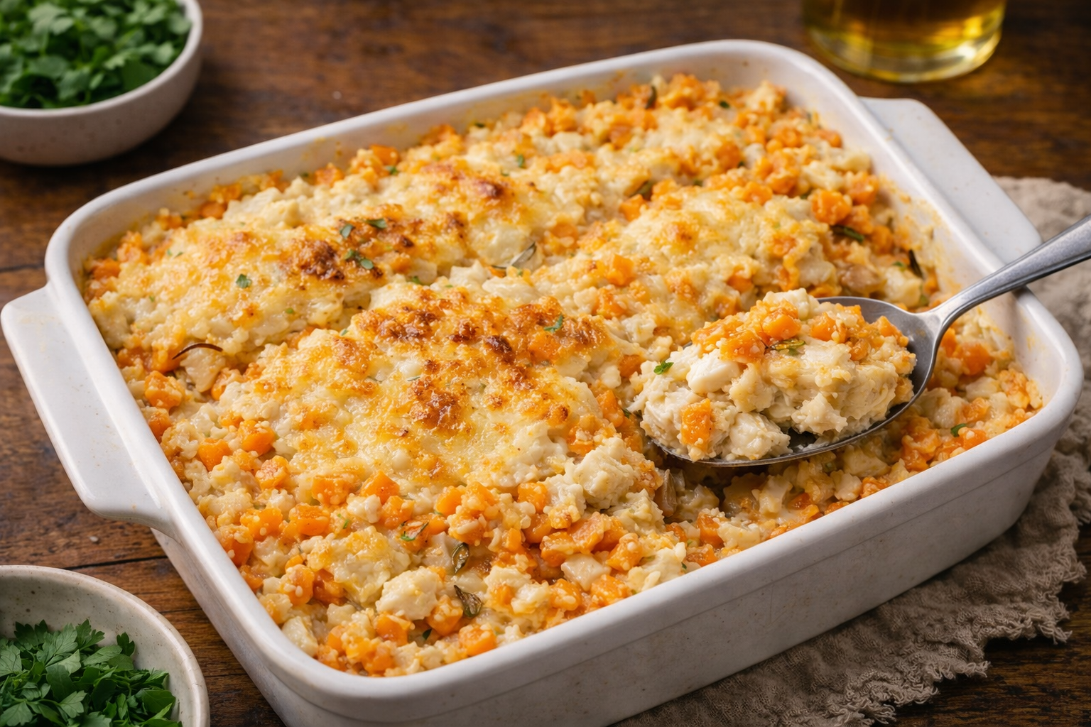 Noutra travessa, disponha as batatas, tempere com sal e pimenta e regue com um fio de azeite. Envolva bem e leve ao forno a 200ºC por 30 minutos até ficarem bem douradas.