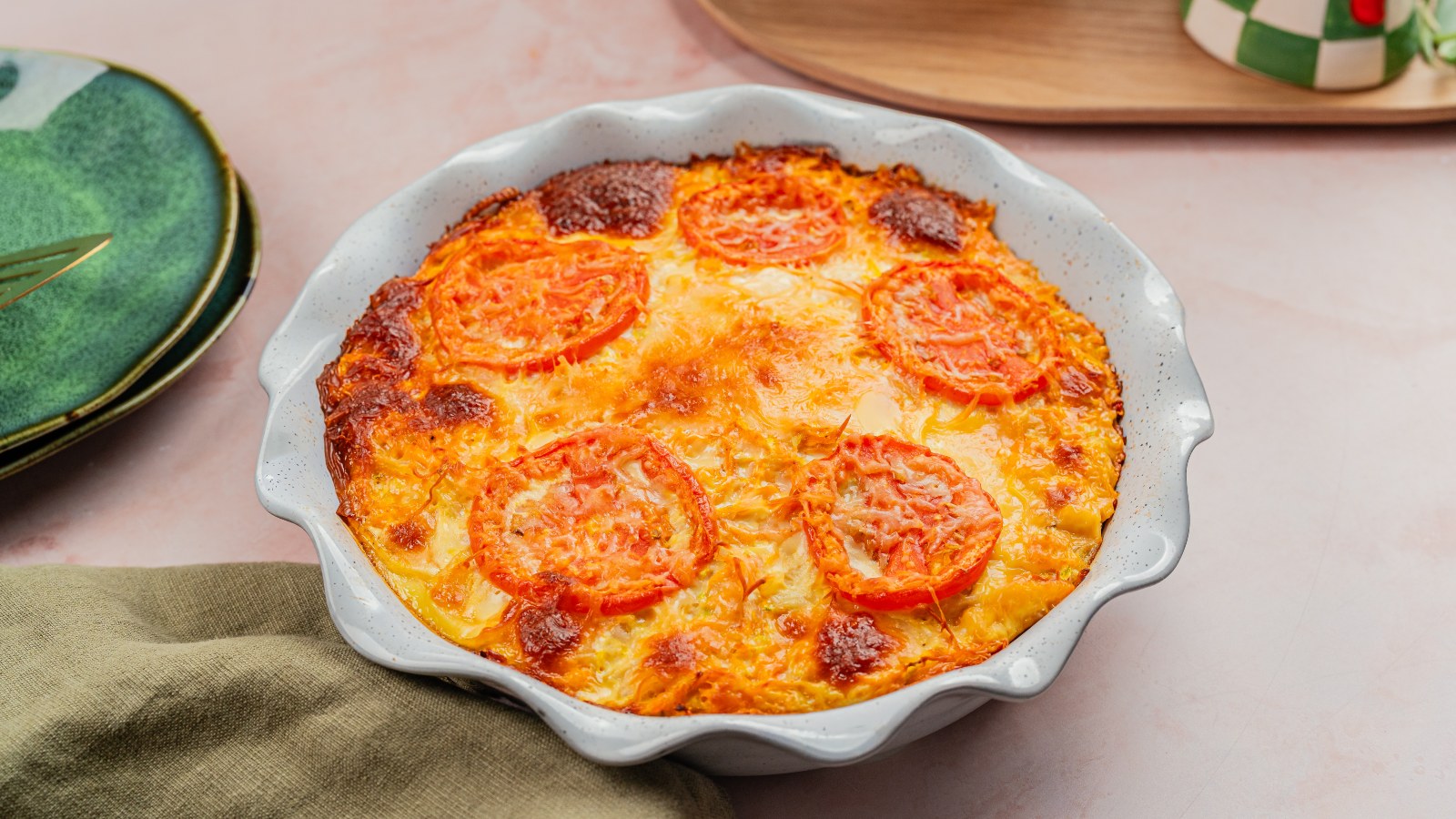 Unte uma travessa com azeite e verta o preparado. Disponha o tomate fatiado por cima e polvilhe com o restante queijo ralado.