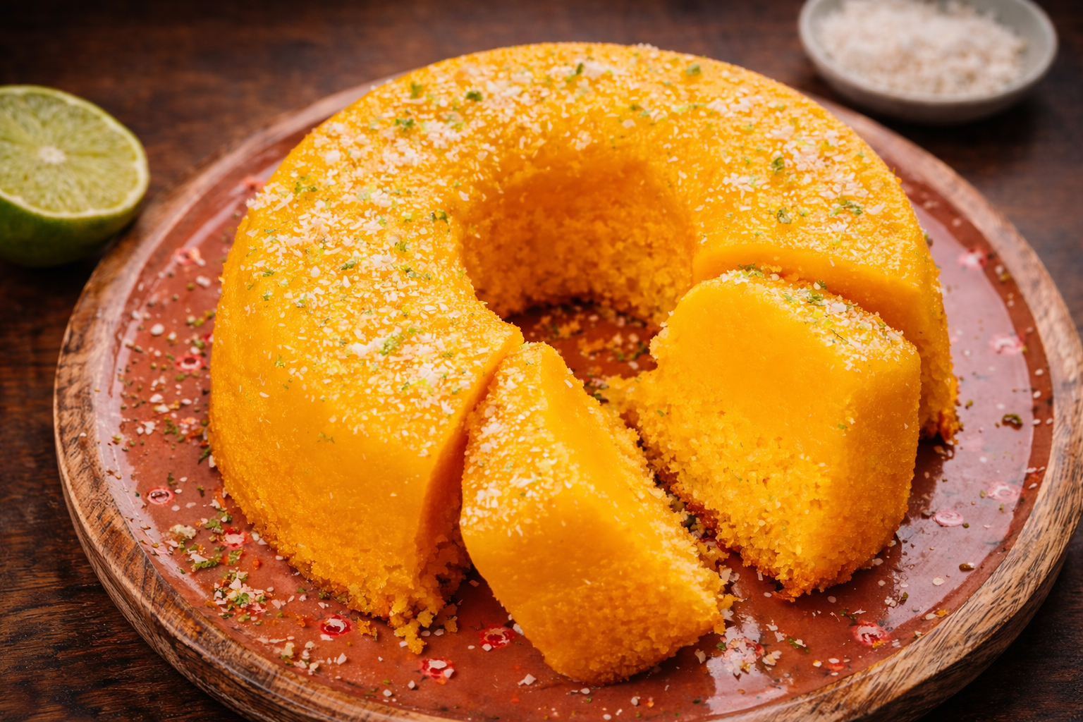 Retire do forno, deixe arrefecer, desenforme e sirva o quindim decorado com coco ralado e raspa de lima.