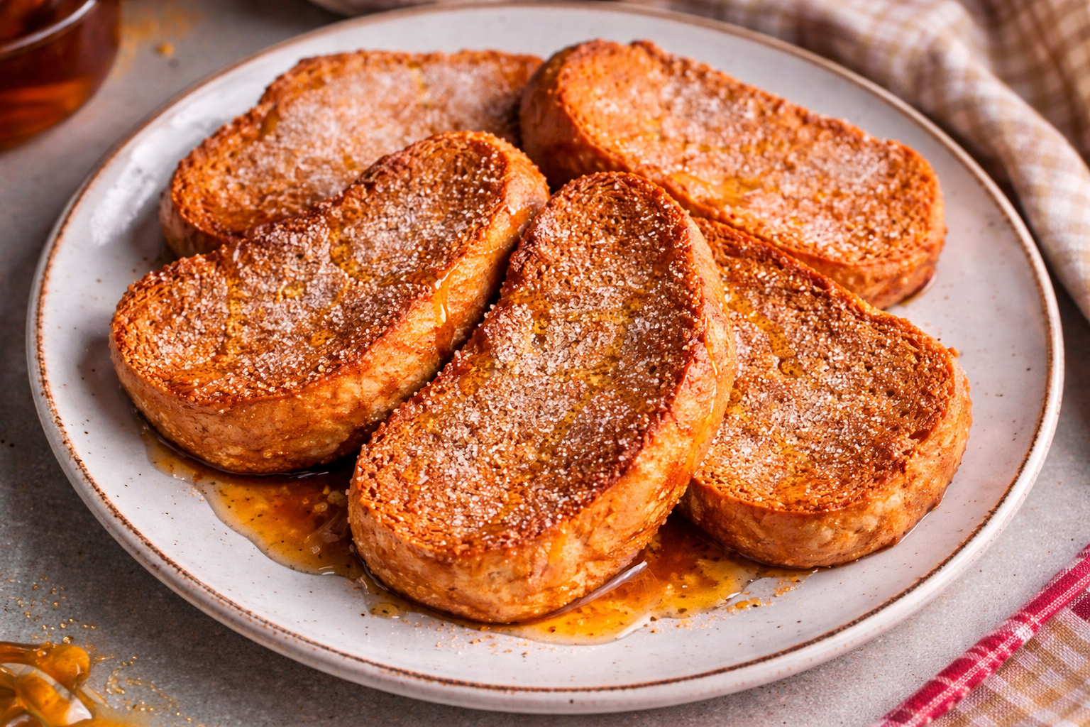 Prepare 3 pratos rasos: o primeiro com o leite morno e doce, o segundo com os ovos batidos e o terceiro com uma mistura de açúcar e canela.