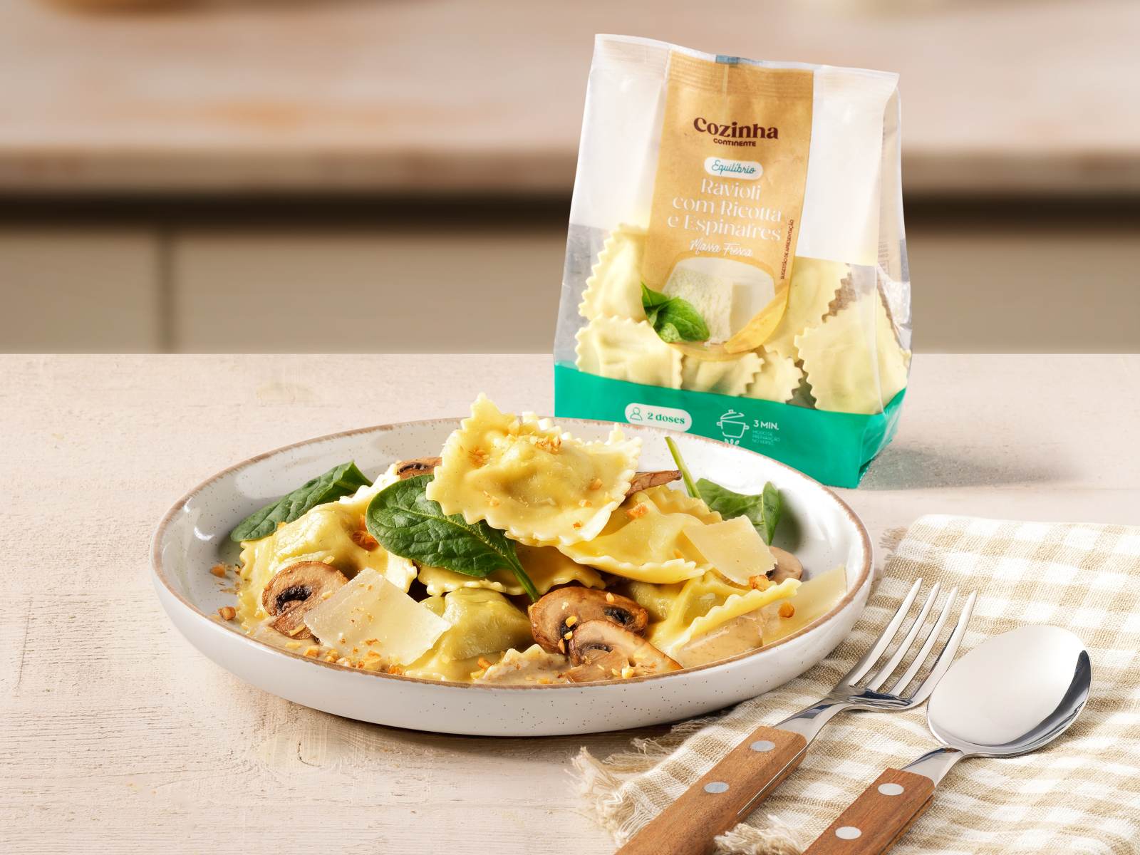 Descubra uma deliciosa receita de raviolis com ricotta e espinafres, criada pelo Chef Gonçalo Ribeiro com os Raviolis da Cozinha Continente. Com cogumelos salteados, noz torrada e lascas de parmesão, este prato combina cremosidade, textura e um sabor sofisticado.