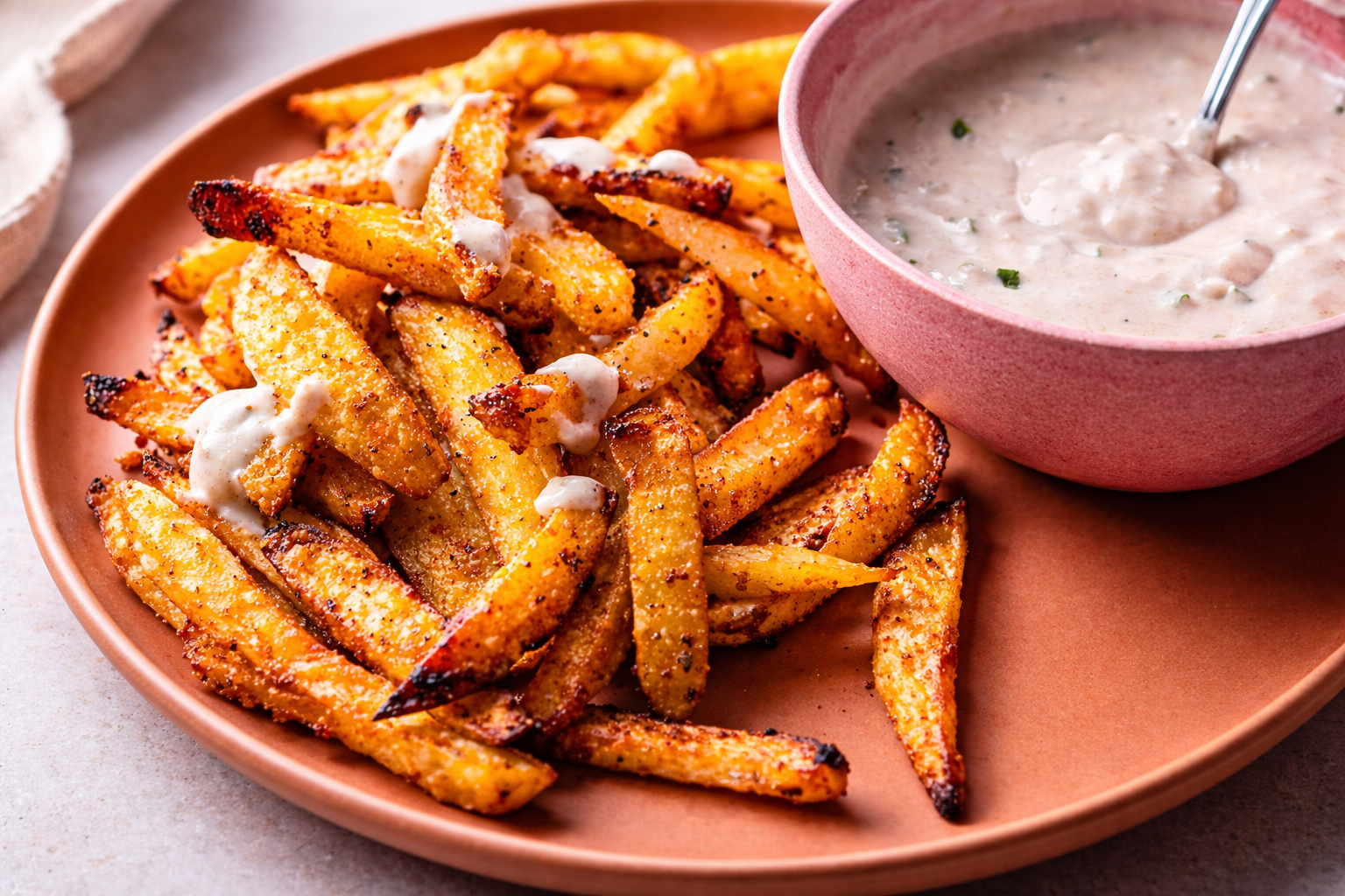Numa taça, misturar a maionese, a mostarda, as natas de soja e o iogurte natural. Temperar com sal e pimenta e envolver bem. Reservar.