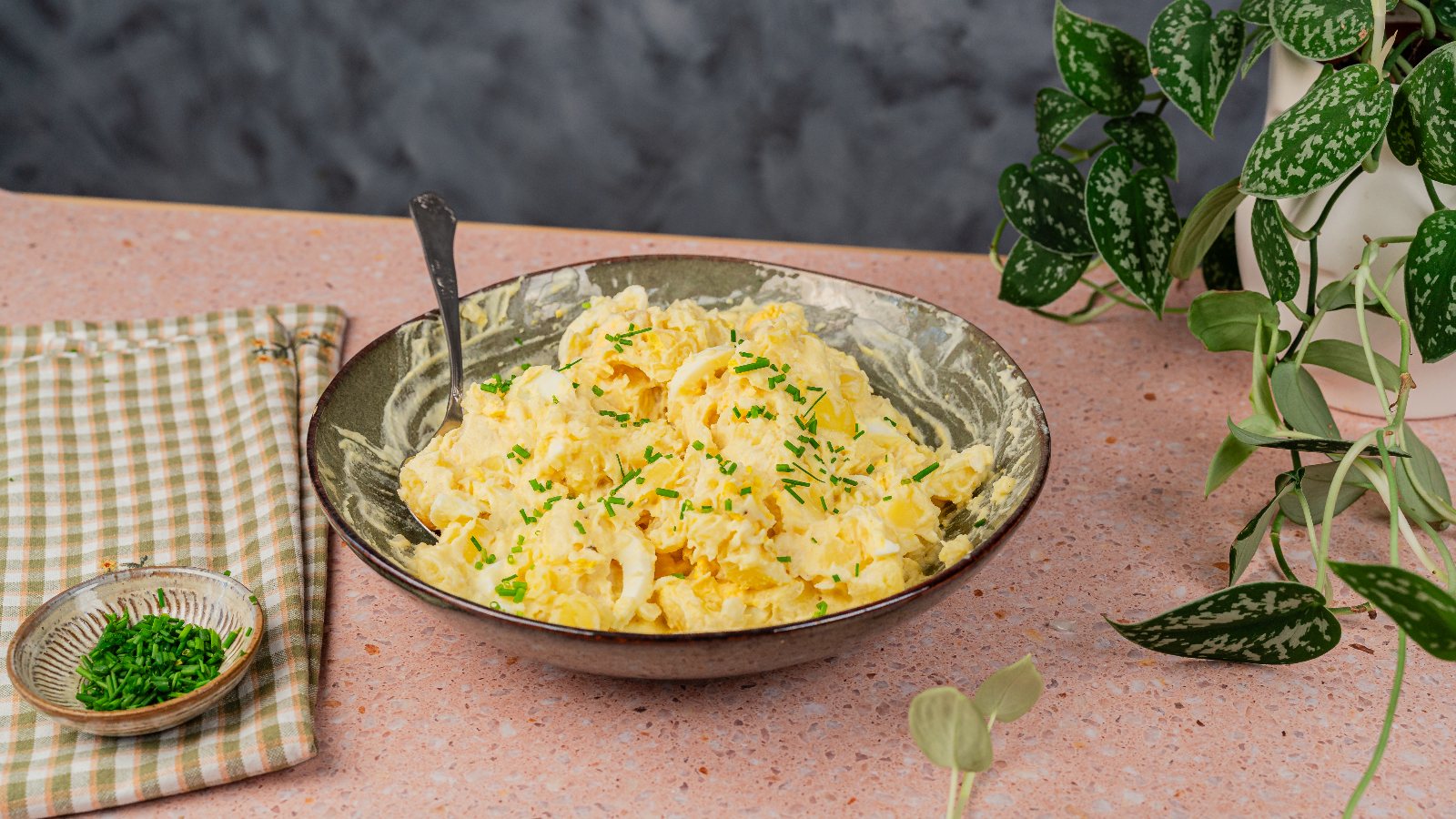 Numa saladeira, colocar a batata cozida, a cebola, os dentes de alho e misturar bem. Juntar os ovos e regar com o molho. Envolver bem.