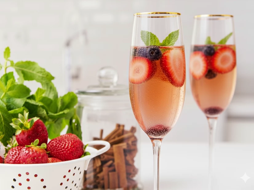 Colocar num jarro 150 g de frutos vermelhos congelados, 4 c. de sopa de açúcar mascavado e a garrafa de espumante.
