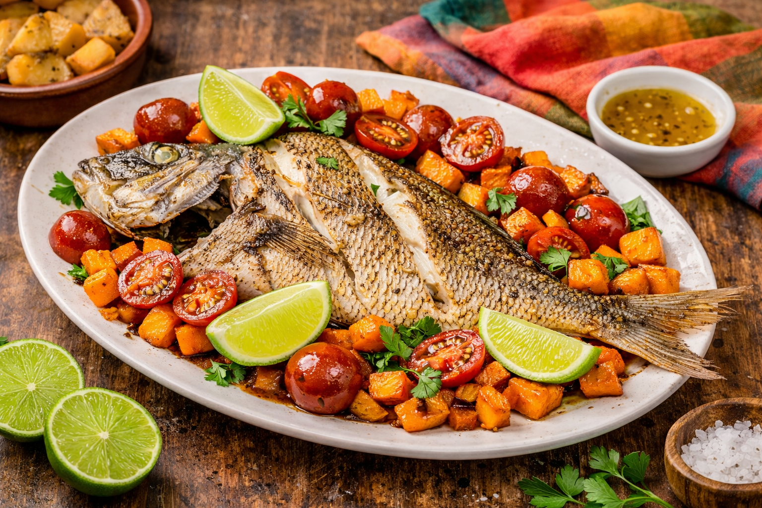 Sirva o sargo no forno acompanhado da batata-doce assada e do tomate-cereja temperado. Decore com gomos de lima antes de servir.