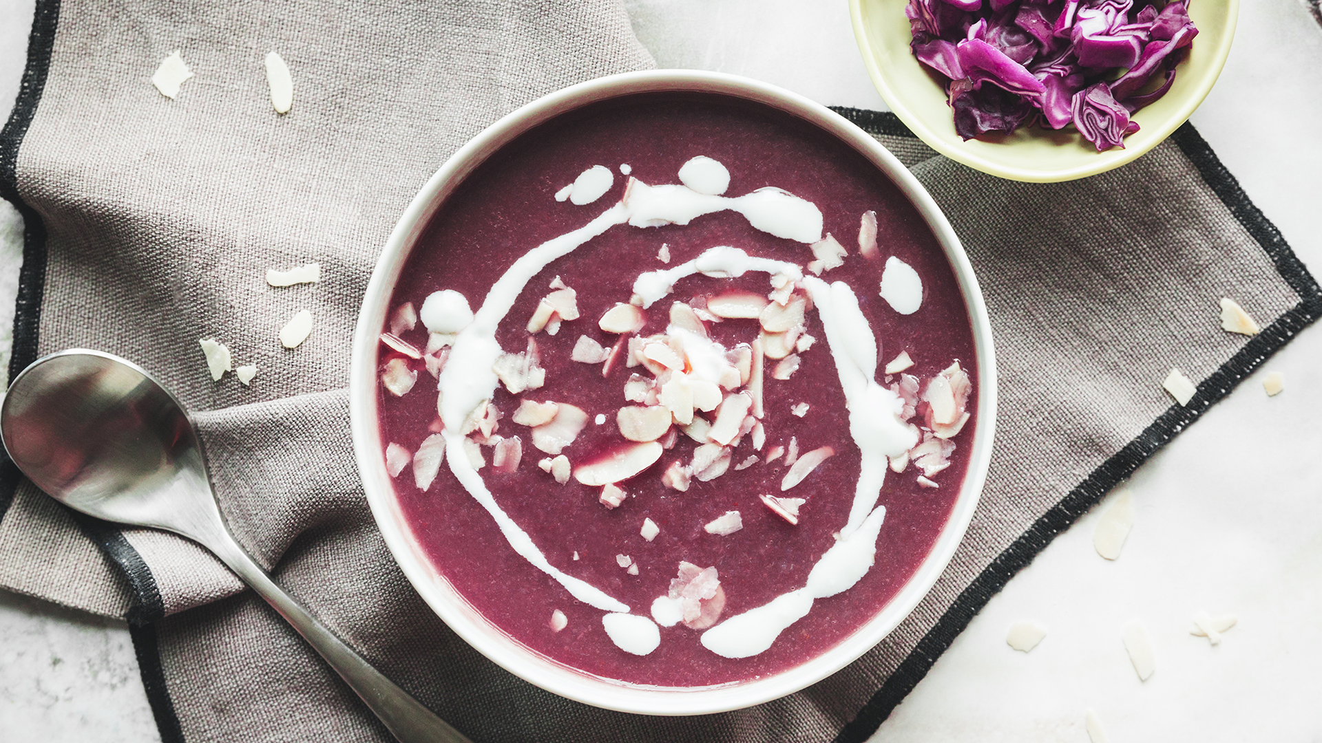 Sirva a sopa de couve lombarda decorando com um fio de azeite.